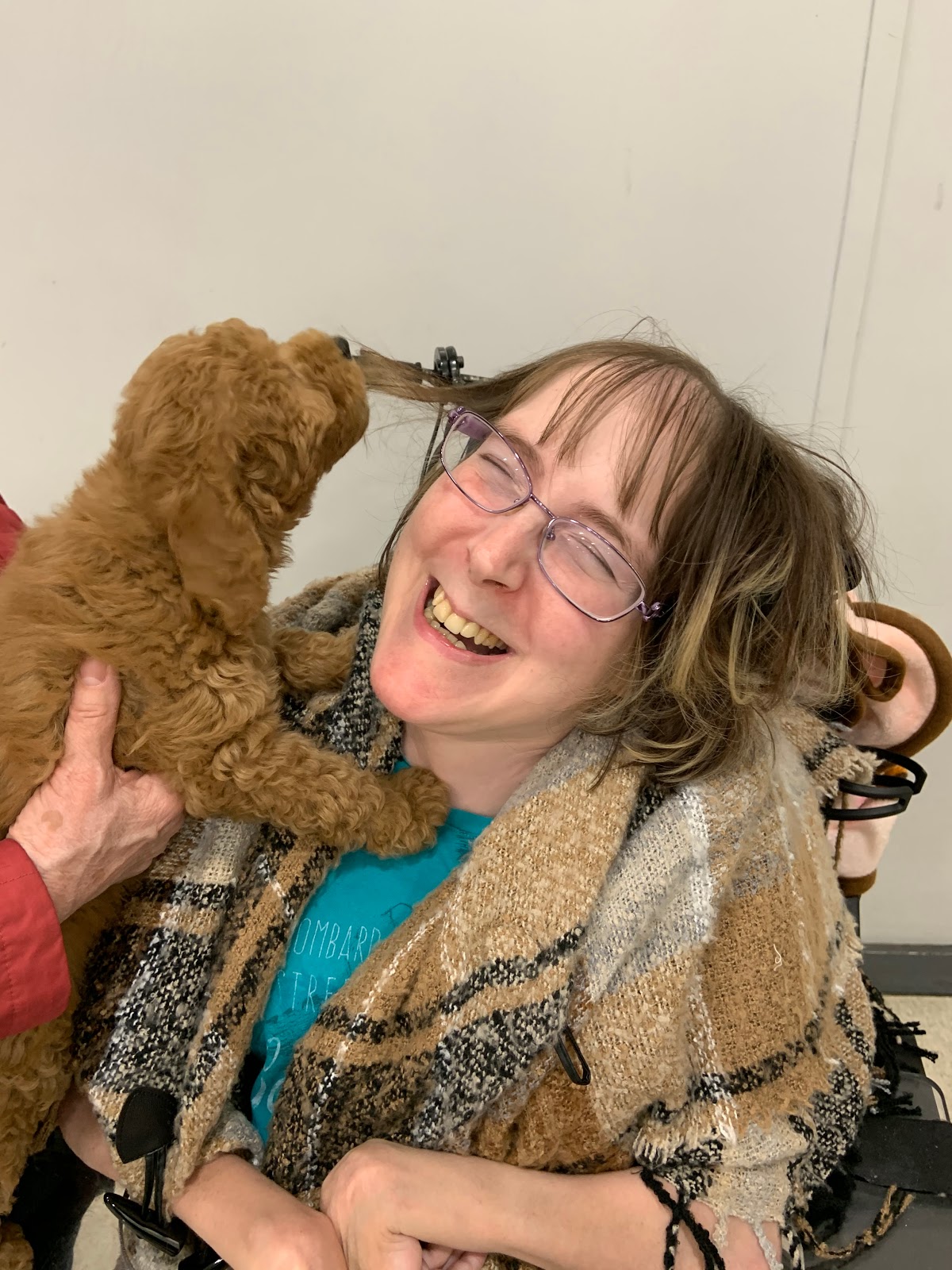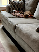During most naps, she can be found on my couch in the living or in the crate. She just loves being around people. Her favorite spot seems to be in mom’s lap on the couch in front of the fire while we are watching TV together.