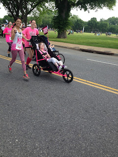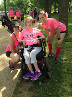 I don’t remember if there was a gun to signal the beginning of the race, but next thing I know we were off. Amy decided to run first pushing my wheelchair along as Jackie ran beside me. A gentle breeze kept me cool as the pavement pounded beneath my chair; even though I was sitting down, I felt like I was running. I tried my best to take in the scenery, but we were going pretty. During the race, I heard an occasional spectator yell “Go Team Debbie” as we sped past. Occasionally, I had the opportunity to speak to Jackie about my future plans as she ran beside me. (see below)