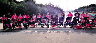 So it was a go. I was set to race in the Semper Fi 5K. This race was in an effort to raise money for a fund in the same name, which supports those who are wounded during the war and need help adjusting when they return home as a civilian. So, on Saturday, my parents and I got up at 5 AM in order to drive and meet the group at East Potomac Park by 715 a.m. In all there were 12 teams, one for each disabled person, and 22 runners that pushed the racing chairs. My chair had a flag that said “Team Debbie” and my team runners were Amy and Jackie. Amy is a schoolteacher and Jackie is a Intel analyst and retired from the Army. Before the race started, every chair was tested and taken for a test run. They secured me with a chest strap and I was ready to go. As it turned out, this was Jackie’s first race with the Angels as well as mine; we both had to get used to how Phoenix (our chair) moved as well as felt. When everyone arrived, we decided to take a picture around the Reflection Pool by the Lincoln Memorial. (See below)