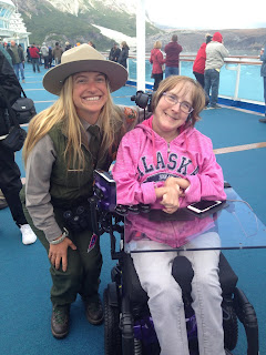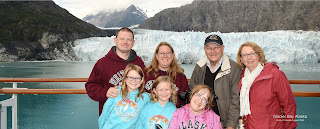 Wednesday was relaxing day on board as we moved through Glacier Bay National Park. Park Rangers climbed aboard in the early morning hours to answer any questions the passengers may have had; I even got my picture taken with one of them. Below is a picture of my family and I took at the Margerie Glacier.