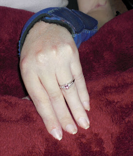 It just occurred to me that I haven’t updated you on my therapy adventures in the last several weeks. I am slowly making progress, gaining several degrees in my arm by stretching with the help of dry heat.. I have continued to use my original purple splint during the day to mainain my wrist extension. Here is a picture of what it looks like: