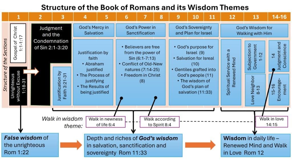 The structure of the book is illustrated in the figure below, highlighting where Paul emphasizes wisdom (false and true) and uses the work “walk” to refer to the walk of wisdom or daily conduct of walking with God. The chart also shows the verses where the wisdom theme is progressively introduced.
