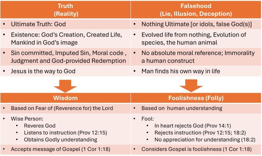 The distinction between Truth and Falsehood is contrasted in the chart below. The chart also illustrates how Truth leads to Godly wisdom and falsehood leads to foolishness (or folly). These results are descriptions of ways of life: the wise person in contrast with the fool. Here are the characteristics, according to Scripture: