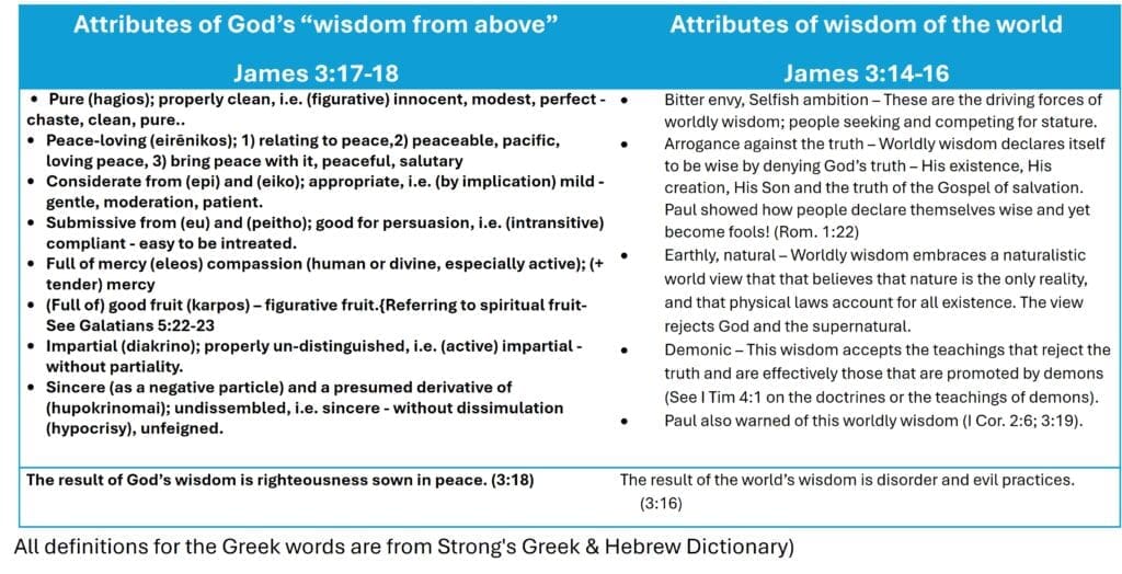 The following chart contrasts the attributes of God’s wisdom based on truth with the world’s wisdom, and the result of each behavior.